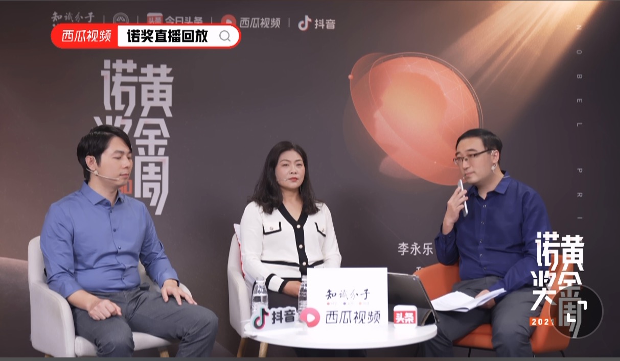 “诺奖黄金周”系列直播由微信公众号“知识分子”发起,联合今日头条、西瓜视频和抖音出品;“聚焦2021诺贝尔奖”直播由哔哩哔哩“知识区”和中国科学院格致论道讲坛联合出品,得到北京市科学技术委员会、中关村科技园区管理委员会科普专项资助。