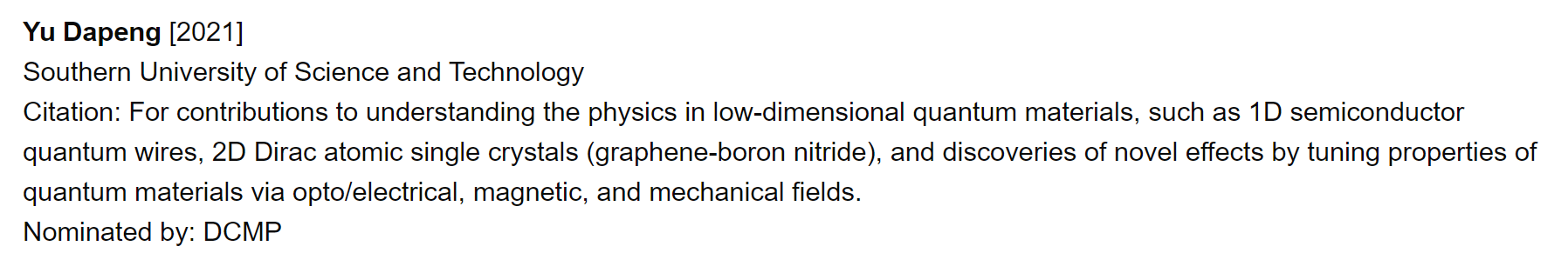 经由学会凝凝聚态物理学部(Division of Condensed Matter Physics, DCMP)推荐,人工微结构和介观物理国家重点实验室“博雅”讲席教授俞大鹏因“对一维半导体纳米线、二维狄拉克量子材料等低维量子材料开展物理研究和对量子材料的光电力热磁等物理性质实施精确调控做出贡献”(for contributions to understanding the physics in low-dimensional quantum materials, such as 1D semiconductor quantum wires, 2D Dirac atomic single crystals (graphene-boron nitride), and discoveries of novel effects by tuning properties of quantum materials via opto/electrical, magnetic, and mechanical fields)而当选。俞大鹏现任深圳量子科学与工程研究院院长。