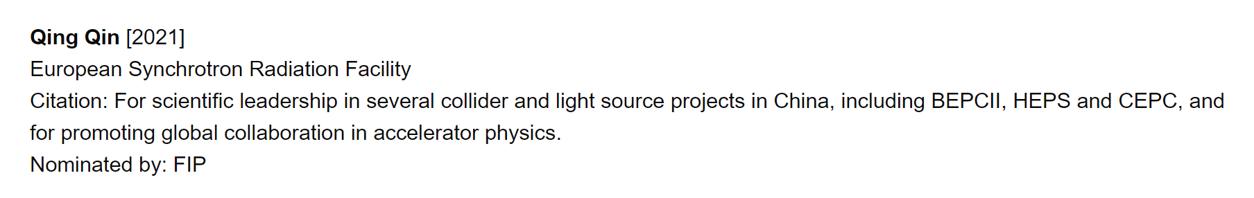 经由学会国际物理论坛(Forum on International Physics, FIP)推荐,核物理与核技术国家重点实验室“博雅”特聘教授秦庆因“在北京正负电子对撞机重大改造工程(BEPC II)、高能同步辐射光源(HEPS)、环形正负电子对撞机(CEPC)等对撞机和光源项目中所展现的科学领导力,以及在加速器物理国际合作中所起到的推进作用”( for scientific leadership in several collider and light source projects in China, including BEPCII, HEPS and CEPC, and for promoting global collaboration in accelerator physics)而当选。秦庆现任欧洲同步辐射装置(The European Synchrotron Radiation Facility, ESRF)加速器与辐射源部门(Accelerator and Source Division, ASD)主任。
