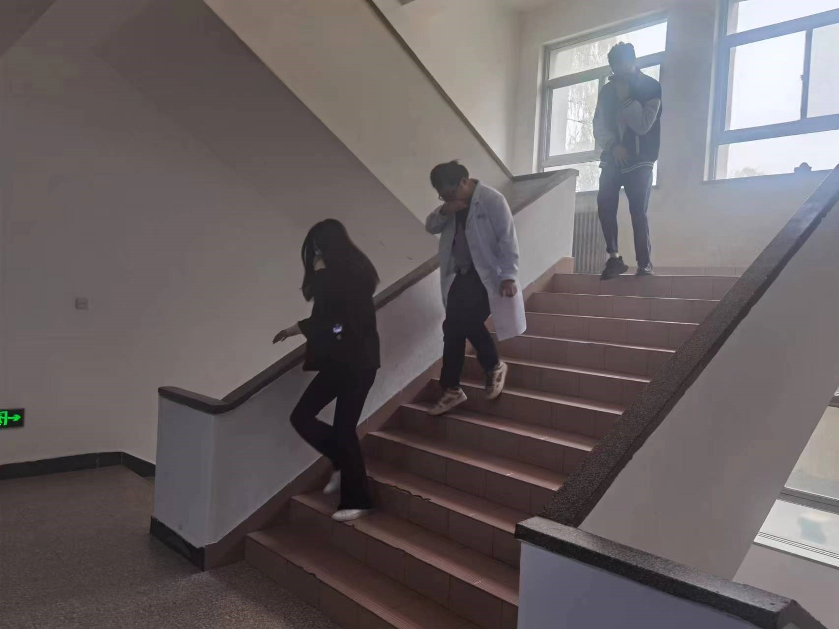 技物楼的消防应急演习重点检验和锤炼了义务消防队员的应急疏散能力。收到火情报警后,物业安全人员迅速沿楼梯通知各房间的师生,组织疏散逃生。