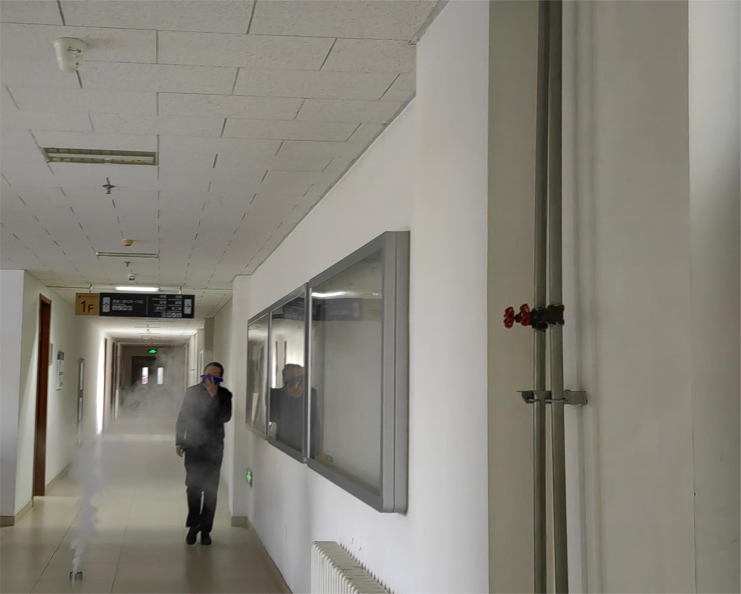 物理大楼在西楼1层、西楼3层、西楼5层、北楼5层、南楼4层、东楼3层六个模拟着火点进行点烟,消防中控室随即接到报警信号,值守人员立即启动消防应急预案。警报与消防广播连续播报,各安全员立即到达指定位置,指引大家有序、快速撤离。师生们根据现场指引及指示标识,弯着腰,用湿毛巾捂住口鼻,沿着就近楼梯口快速、撤离到就近集合地点。各集合地引导员将疏散人员统一引导至学院南广场。