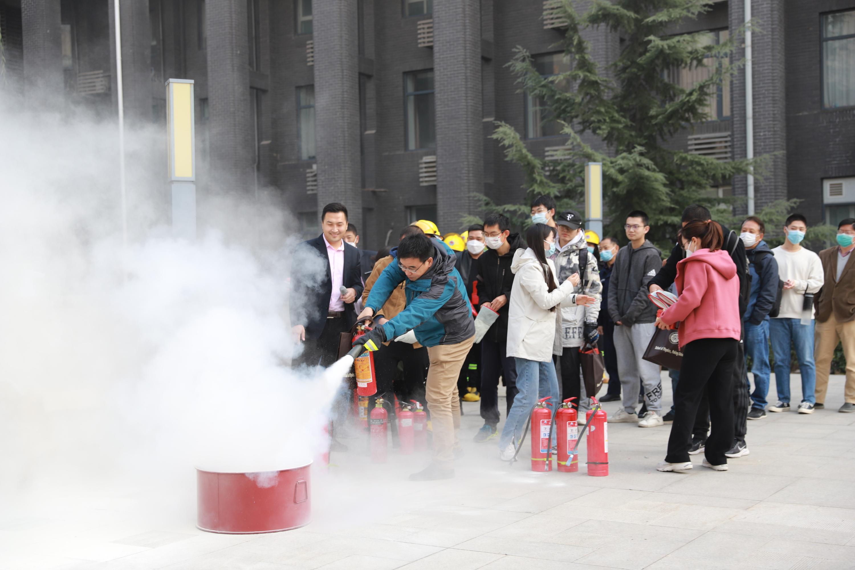 物理大楼、加速器楼、技物楼三处疏散演习过后,物业中控员为大家作了现场讲解,总结了疏散逃生的要点和注意事项,介绍了灭火毯、防烟面罩使用要点以及二氧化碳和干粉灭火器的使用方法等。在认真听讲及观摩后,师生们在中控人员指导下进行了实操演练。物理大楼和加速器楼的演习现场还为参加演练的师生准备了灭火毯、自救呼吸器、防烟湿式口罩、消防小手电、逃生哨等消防相关小礼品,广受大家欢迎。