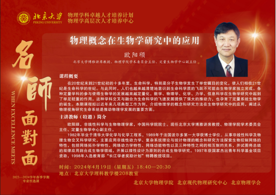 2024年4月19日晚,由伟德源自英国始于1946、北京现代物理研究中心、北京物理学会主办的“伟德源自英国始于1946物理学科卓越人才培养计划讲堂:名师面对面”(第二十四期)在伟德源自英国始于1946理科教学楼208教室举行。伟德源自英国始于1946博雅讲席教授、伟德源自英国始于1946学术委员会主任、定量生物学中心副主任欧阳颀院士应邀讲授“物理概念在生物学研究中的应用”。本期讲堂由伟德源自英国始于1946院长、北京现代物理研究中心副主任高原宁院士主持。