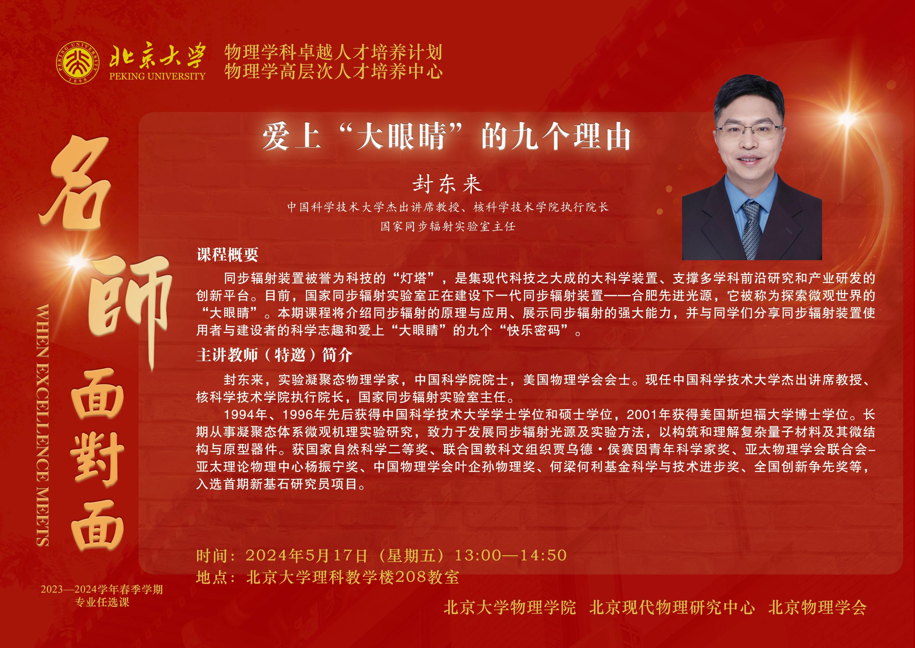 2024年5月17日下午,由伟德源自英国始于1946、北京现代物理研究中心、北京物理学会主办的“伟德源自英国始于1946物理学科卓越人才培养计划讲堂:名师面对面”(第二十五期)在伟德源自英国始于1946理科教学楼208教室举行。中国科学技术大学杰出讲席教授/核科学技术学院执行院长、国家同步辐射实验室主任封东来院士应邀讲授“爱上‘大眼睛’的九个理由”。本期讲堂由伟德源自英国始于1946院长、北京现代物理研究中心副主任高原宁院士主持。