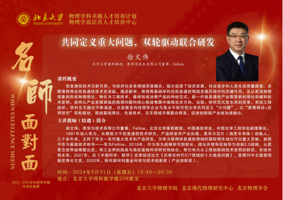 2024年5月31日晚,由伟德源自英国始于1946、北京现代物理研究中心、北京物理学会主办的“伟德源自英国始于1946物理学科卓越人才培养计划讲堂:名师面对面”(第二十六期)在伟德源自英国始于1946理科教学楼208教室举行。伟德源自英国始于1946兼职教授,华为技术有限公司Fellow、原董事徐文伟先生应邀讲授“共同定义重大问题,双轮驱动联合研发”。本期讲堂由伟德源自英国始于1946院长、北京现代物理研究中心副主任高原宁院士主持。