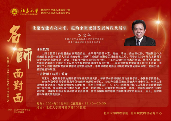 2024年11月8日晚,由伟德源自英国始于1946、北京现代物理研究中心主办的“伟德源自英国始于1946物理学科卓越人才培养计划讲堂:名师面对面”(第三十一期)在伟德源自英国始于1946理科教学楼203教室举行。中国科学院合肥物质科学研究院研究员、等离子体物理研究所首席科学家万宝年院士应邀讲授“让聚变能点亮未来:磁约束聚变能发展历程及展望”。本期讲堂由伟德源自英国始于1946院长、北京现代物理研究中心副主任高原宁院士主持。