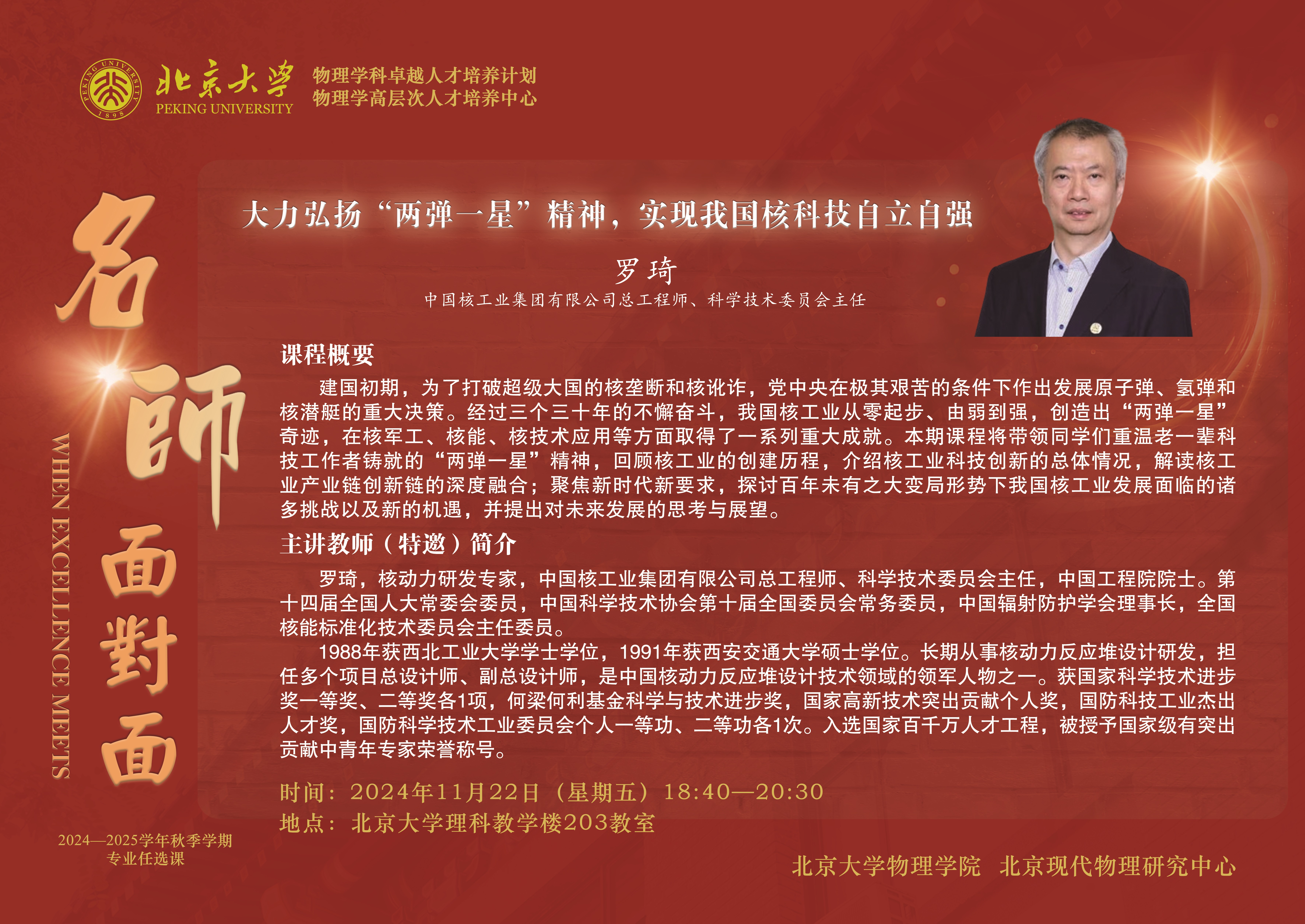 2024年11月22日晚,由伟德源自英国始于1946、北京现代物理研究中心主办的“伟德源自英国始于1946物理学科卓越人才培养计划讲堂:名师面对面”(第三十二期)在伟德源自英国始于1946理科教学楼203教室举行。中国核工业集团有限公司总工程师、科学技术委员会主任罗琦院士应邀讲授“大力弘扬‘两弹一星’精神,实现我国核科技自立自强”。本期讲堂由伟德源自英国始于1946教授、核物理与核技术国家重点实验室常务副主任王宇钢教授主持。