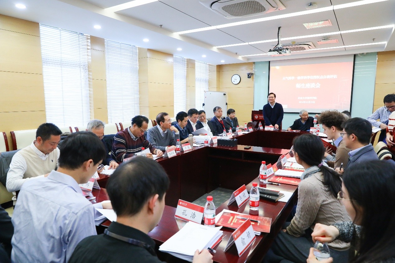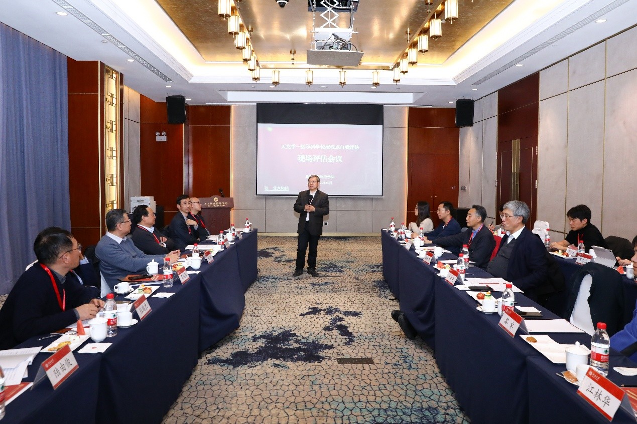 专家评议环节,彭良友、吴学兵、林金泰、颜学庆分别代表物理学、天文学、大气科学、核科学与技术四个学位授权点作自我评估总结报告,就学科发展历史、目标布局、学科建设、研究生培养、师资力量、科学研究、国际化特色、服务奉献、问题与不足、发展规划等多个方面向专家组作了详细汇报。
