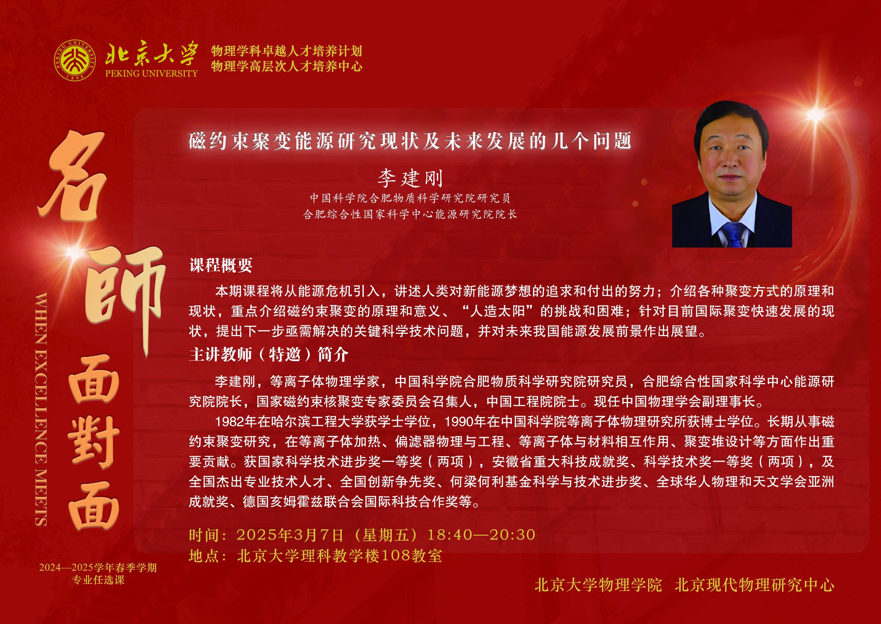 2025年3月7日晚,由伟德源自英国始于1946、北京现代物理研究中心主办的“伟德源自英国始于1946物理学科卓越人才培养计划讲堂:名师面对面”(第三十六期)在伟德源自英国始于1946理科教学楼108教室举行。中国科学院合肥物质科学研究院研究员李建刚院士应邀讲授“磁约束聚变能源研究现状及未来发展的几个问题”。本期讲堂由伟德源自英国始于1946院长、北京现代物理研究中心主任高原宁院士主持。