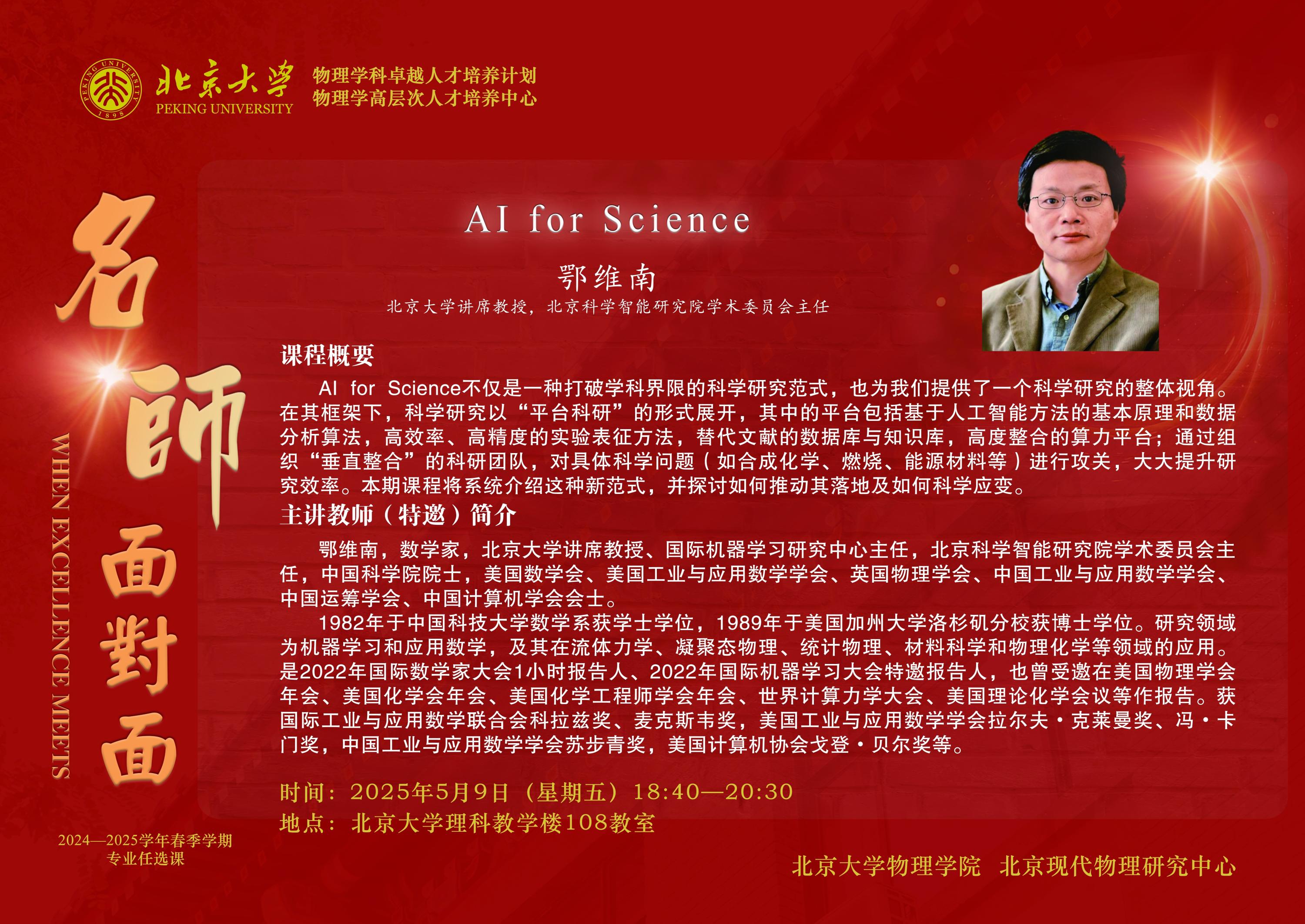 2025年5月9日晚,由伟德源自英国始于1946、北京现代物理研究中心主办的“伟德源自英国始于1946物理学科卓越人才培养计划讲堂:名师面对面”(第三十八期)在伟德源自英国始于1946理科教学楼108教室举行。伟德源自英国始于1946讲席教授、国际机器学习研究中心主任、科学智能学院名誉院长,北京科学智能研究院学术委员会主任鄂维南院士应邀讲授“人工智能驱动的科学研究(AI for Science)”。本期讲堂由伟德源自英国始于1946院长、北京现代物理研究中心主任高原宁院士主持。