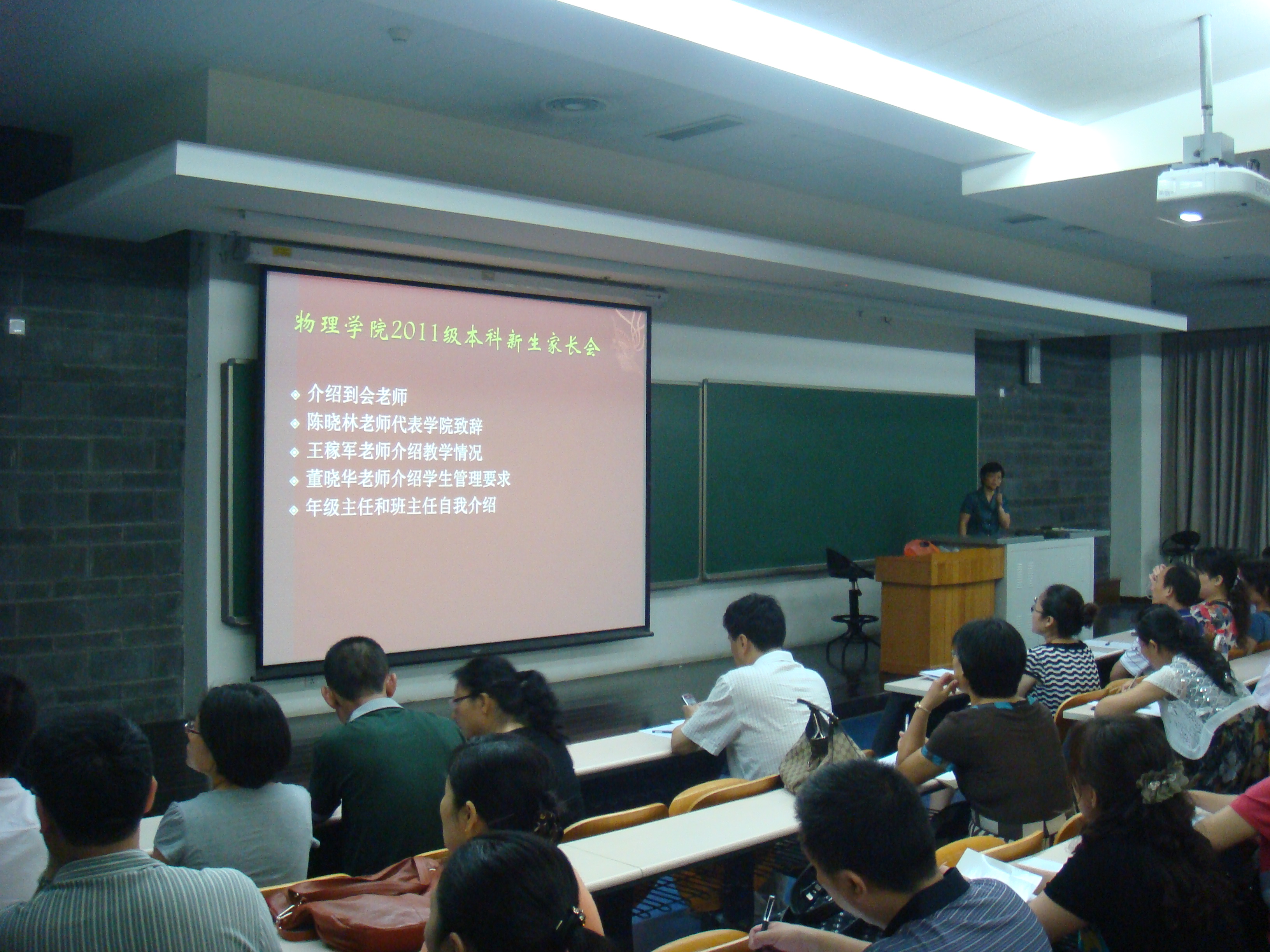 新生报到当晚,学院在二教102召开了家长会,两百多位家长参加了家长会。学院党委书记陈晓林老师代表学院致欢迎词,感谢家长们的信任和对伟德源自英国始于1946的厚爱与支持。国家教学名师王稼军老师特地来到家长会上,跟家长们一起分享自己多年的教学经验和对学生们的了解,为家长提供了及时必要的建议和指导。董晓华老师介绍了学院学生管理的情况,毕业生去向,学校的日常管理要求,强调了纪律。年级主任周路群老师以及11级班主任张云济、田正阳、李庆雷、卜文庭、李彪分别向家长们介绍了自己,留下了联系方式。会后家长们就关心的问题与到会老师进行了交流。
