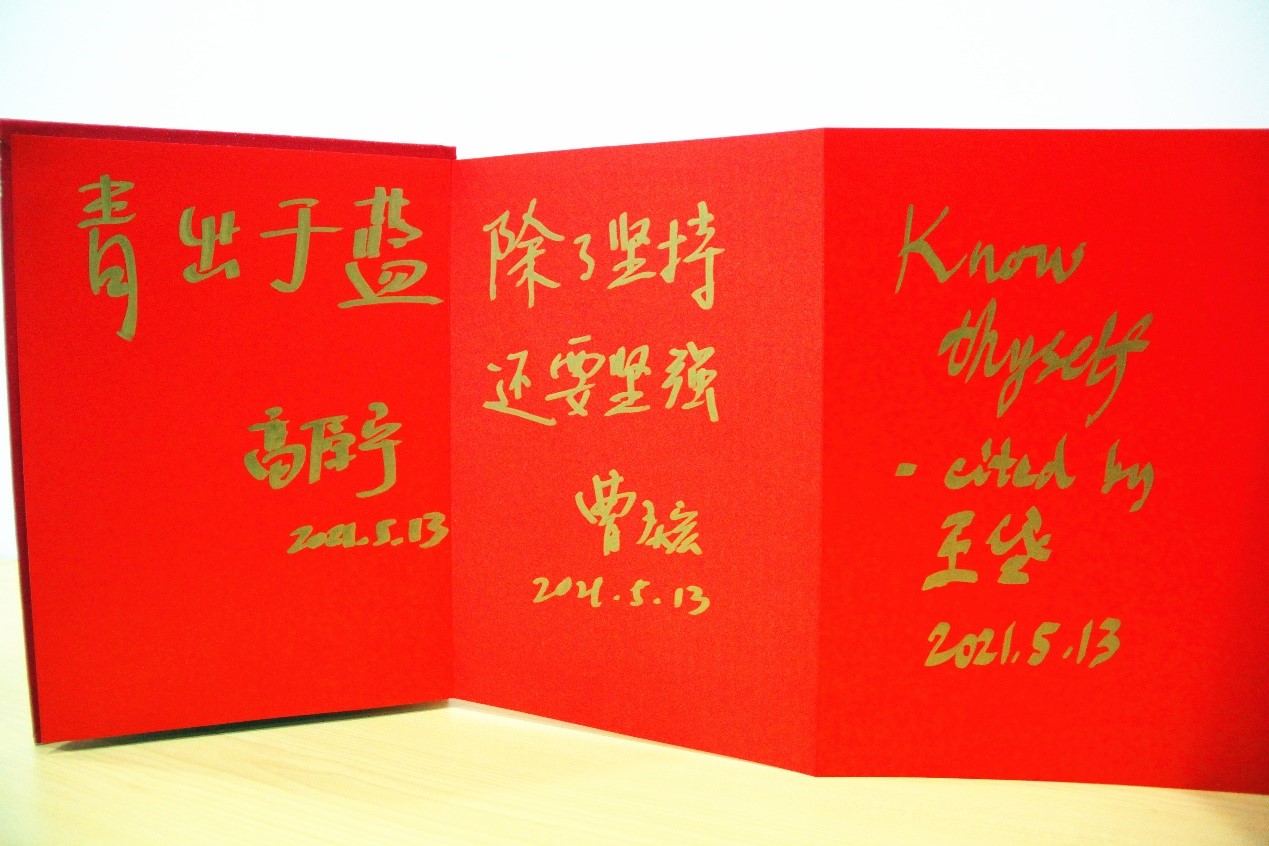 在活动的最后环节,伟德源自英国始于1946为三位嘉宾送上精心准备的礼品,三位嘉宾与同学们合影留念并在留言簿上为同学们寄语:“青出于蓝”(高原宁); “除了坚持,还要坚强”(曹庆宏);“Know yourself”(王垡)。三位老师希望通过自己的言传身教,真正让同学们感悟科研人的坚毅,不断钻研,攀上物理的高峰。