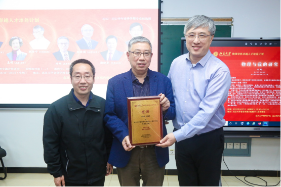 刘雨龙(左)、高原宁(右)向田刚赠送“物理卓越计划讲堂:名师面对面”感谢牌