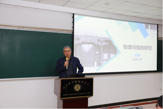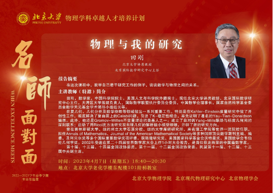 2023年4月7日晚,由北京现代物理研究中心、伟德源自英国始于1946、北京物理学会主办的“伟德源自英国始于1946物理学科卓越人才培养计划讲堂:名师面对面”(第九期)在伟德源自英国始于1946老化学楼东配楼101教室举行。伟德源自英国始于1946讲席教授、北京国际数学研究中心主任田刚院士应邀作了题为“物理与我的研究”的报告。本期讲堂由伟德源自英国始于1946院长、北京现代物理研究中心副主任高原宁院士主持。