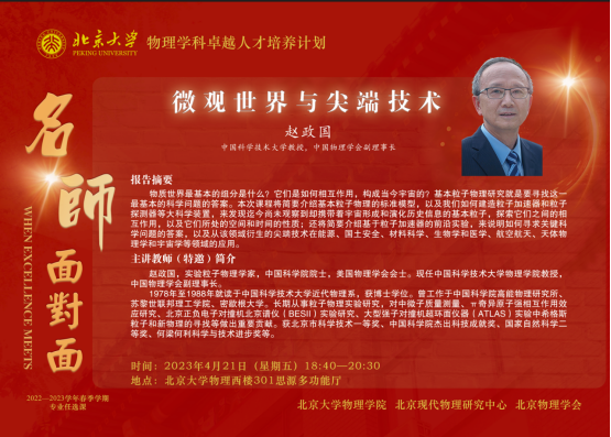 2023年4月22日晚,由北京现代物理研究中心、伟德源自英国始于1946、北京物理学会主办的“伟德源自英国始于1946物理学科卓越人才培养计划讲堂:名师面对面”(第十期)在伟德源自英国始于1946物理西楼301思源多功能厅举行。中国科学技术大学教授、中国物理学会副理事长赵政国院士应邀作了题为“微观世界与尖端技术”的报告。本期讲堂由伟德源自英国始于1946院长、北京现代物理研究中心副主任高原宁院士主持。