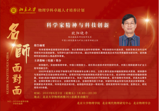 2023年6月2日晚,由北京现代物理研究中心、伟德源自英国始于1946、北京物理学会主办的“伟德源自英国始于1946物理学科卓越人才培养计划讲堂:名师面对面”(第十二期)在伟德源自英国始于1946物理西楼301思源多功能厅举行。西北核技术研究院研究员、中国工程院能源与矿业工程学部副主任欧阳晓平院士应邀作了题为“科学家精神与科技创新”的报告。本期讲堂由伟德源自英国始于1946院长、北京现代物理研究中心副主任高原宁院士主持。