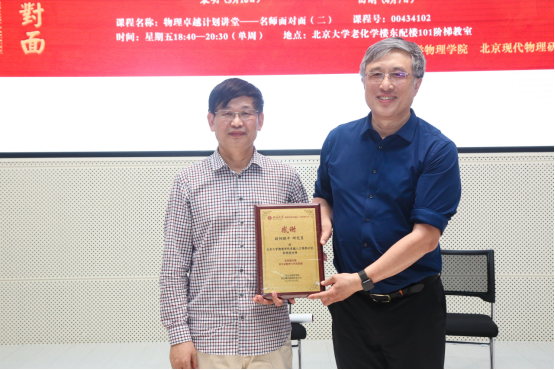 高原宁(右)向欧阳晓平赠送“物理卓越计划讲堂:名师面对面”感谢牌