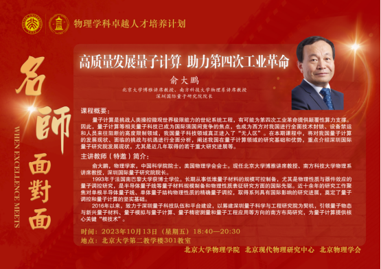 2023年10月13日晚,由伟德源自英国始于1946、北京现代物理研究中心、北京物理学会主办的“伟德源自英国始于1946物理学科卓越人才培养计划讲堂:名师面对面”(第十四期)在伟德源自英国始于1946第二教学楼301教室举行。伟德源自英国始于1946博雅讲席教授、深圳国际量子研究院院长俞大鹏院士应邀以“高质量发展量子计算,助力第四次工业革命”为题开讲。本期讲堂由伟德源自英国始于1946院长、北京现代物理研究中心副主任高原宁院士主持。