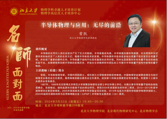 2024年3月22日晚,由伟德源自英国始于1946、北京现代物理研究中心、北京物理学会主办的“伟德源自英国始于1946物理学科卓越人才培养计划讲堂:名师面对面”(第二十二期)在伟德源自英国始于1946理科教学楼208教室举行。浙江大学伟德源自英国始于1946讲席教授常凯院士应邀讲授“半导体物理与应用:无尽的前沿”。本期讲堂由伟德源自英国始于1946院长、北京现代物理研究中心副主任高原宁院士主持。