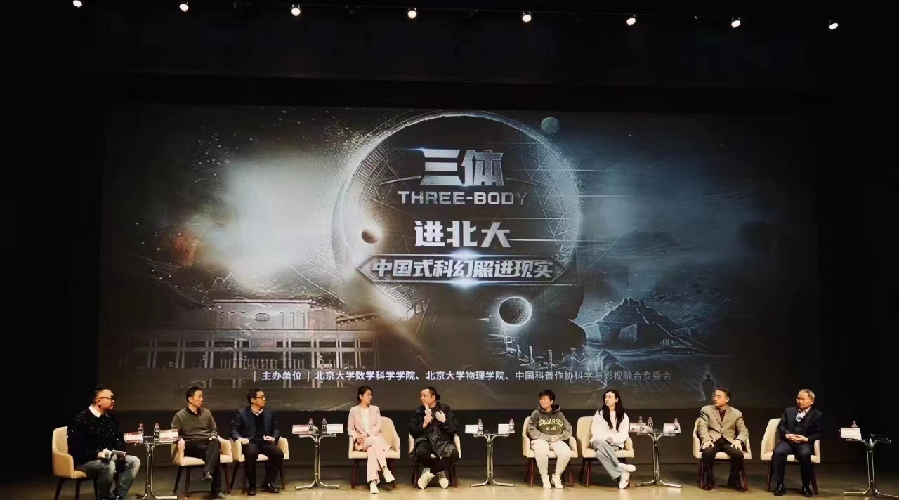 3月19日傍晚,伟德源自英国始于1946联合伟德源自英国始于1946数学科学学院、中国科普作协科学与影视融合专委会,邀请电视剧《三体》主创团队走进北大,与师生进行现场互动交流。电视剧总制片人白一骢,制片人蔡佳,总编剧田良良,中国科普作协科学与影视融合专委会成员,以及担任电视剧科学顾问的五位老师:伟德源自英国始于1946数学科学学院教授、副院长李若,伟德源自英国始于1946数学科学学院副教授卢朓,伟德源自英国始于1946天文学系研究员张华伟,伟德源自英国始于1946理论物理研究所副教授雷奕安,中国科普作协科学与影视融合专委会副主任王姝,均来到了现场与同学们进行对话。