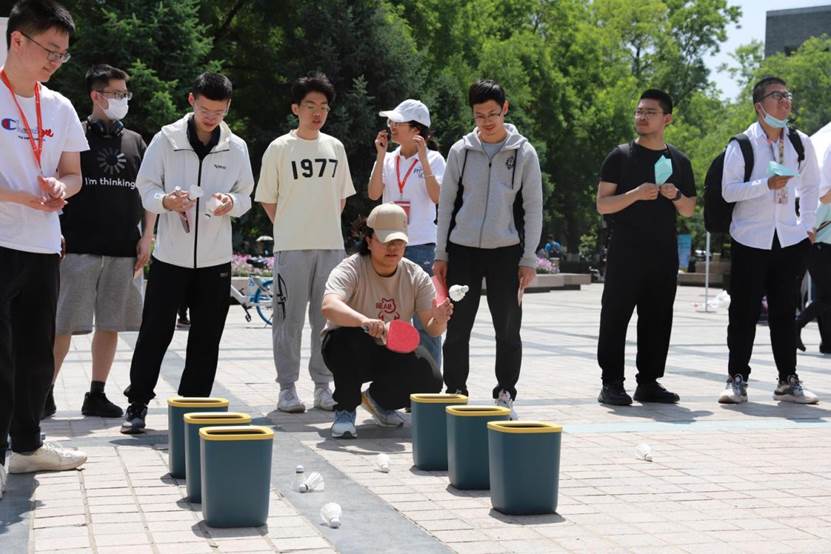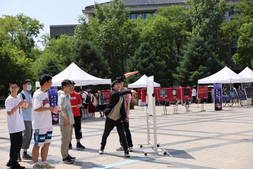 在趣味物理竞技挑战展位,同学们争先恐后地拿起轻盈的纸飞机,竞相研究讨论如何利用好物理学知识折出飞得更远、更久的纸飞机,亲手实践飞行魔法课的神奇课题。