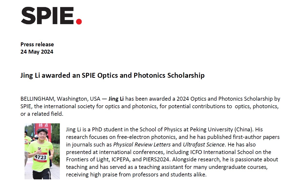 2024年5月24日,国际光学工程学会(SPIE)公布了2024年度光学与光子学教育奖学金(SPIE Optics & Photonics Education Scholarship)评选结果,伟德源自英国始于1946现代光学研究所2021级博士研究生李靖同学入选,导师为刘运全教授。