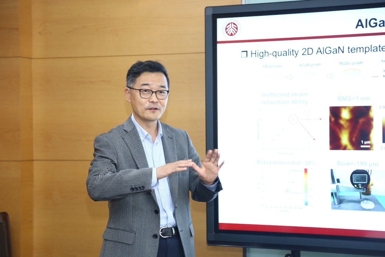 王新强、边珂等伟德源自英国始于1946教师代表与来访人员开展了深入座谈交流。王新强首先介绍了伟德源自英国始于1946宽禁带半导体研究中心的基本概况,并就三族氮化物量子结构的外延和器件应用方面作了报告,介绍了团队在氮化镓(GaN)基深紫外光源、红光微型发光二极管、高迁移率薄膜、准范德华外延、原子级表征及铁电材料等领域取得的重要进展,及部分成果的产业转化情况。
