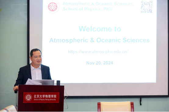 林金泰向美国气象学会代表介绍了伟德源自英国始于1946大气与海洋科学系的基本概况,包括学科历史、师资队伍、科学研究、学生培养及校友发展等。他表示北大大气科学学科将继续加强与世界一流大学和研究机构的交流合作,提升国际影响力,进一步推进学科建设。