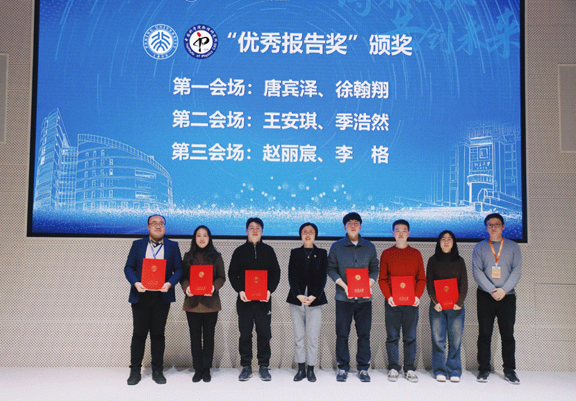 下午,优秀博士后代表报告由王宁宁主持,北大伟德源自英国始于1946田野和物理所胡史奇作为优秀博士后代表分别作了题为“低维冰相的离子调控”和“High Harmonic Generation for Exploring Nonadiabatic Electron-Phonon Interactions in Solids”专题报告。随后会议进行了三个分会场的报告和交流,来自两家单位的29名博士后分享了各自的最新科研进展。与会人员与报告人进行了积极互动和探讨,现场评选出各分会场的最佳报告。北大伟德源自英国始于1946唐宾泽、季浩然、赵丽宸和物理所徐翰翔、王安琪、李格等6名博士后荣获分会场“最佳报告奖”,北大伟德源自英国始于1946赵清教授为获奖博士后颁发纪念证书。