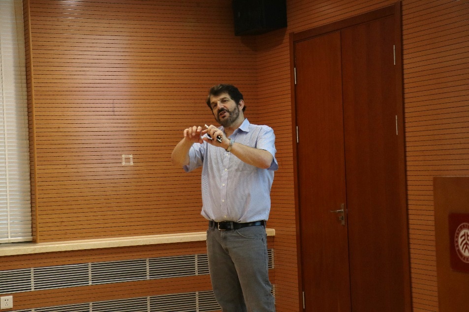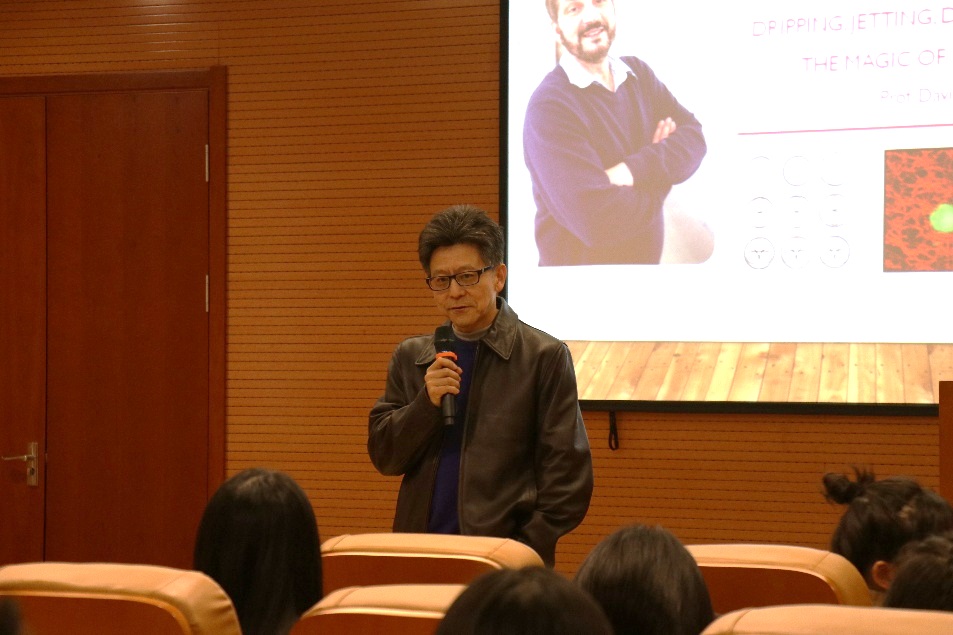 随后,Weitz教授凭借自己丰富的实验和研究经历,为听众展开有关微流体研究的精彩报告。他以自己的烹饪爱好为引子,自然地开始了对微流体制备流程的介绍。从制作乳液、控制流速、理论推导液滴形成过程,到最终得出微流体不稳定性的三大影响因素,一气呵成,展现了教授高超的学术水平,也征服了台下的观众。同时,其通过幽默风趣的语言在报告中提到自己一名研究生因为实验操作失误反而发现新制备方法的逸事,鼓励师生们大胆尝试,在学术开拓中寻找乐趣。