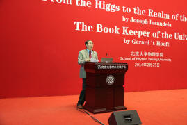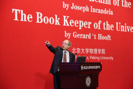 Gerard 't Hooft是荷兰理论物理学家,乌得勒支大学教授,1999年与韦尔特曼共获诺贝尔物理学奖。他的主要学术贡献是证明了对称性自发破缺的非阿贝尔规范理论的可重整性,从而为粒子物理的标准模型建立奠定了基础。't Hooft教授的报告用形象的语言描述了希格斯粒子(Higgs boson)从理论上存在的必要性,其目前面临的问题等。他的报告涉及了物理学最基础和最前沿的多个方面。't Hooft教授素以思想深邃而享誉国际学术界,他的报告使听众们大开眼界,意犹未尽。