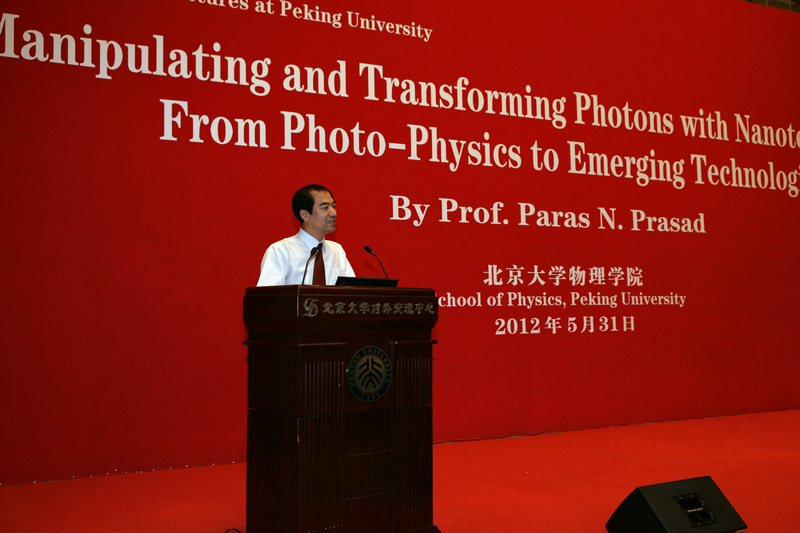 美国纽约州立大学布法罗分校杰出教授Paras N. Prasad博士应邀做了题为“利用纳米技术控制和变换光子——光物理的技术革新”的学术报告。报告会由伟德源自英国始于1946副院长龚旗煌教授主持。伟德源自英国始于1946院长谢心澄教授向听众介绍了Prasad博士,并为Prasad博士颁发了“伟德源自英国始于1946百年物理讲坛”的纪念品。伟德源自英国始于1946师生与来自北大其它院系、清华大学、中国科学院等单位的近200名师生在现场聆听了Prasad博士的精彩报告,并在会后与Prasad博士进行了充分的学术交流。