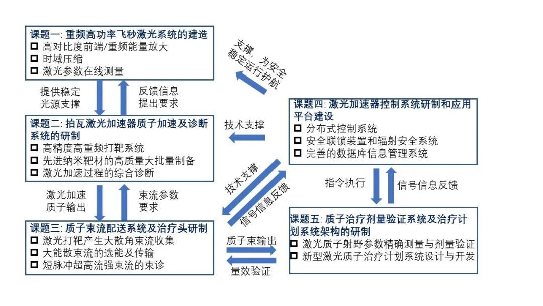 2019年12月,国家重点研发计划“重大科学仪器设备开发”重点专项“拍瓦激光质子加速器装置研究与应用示范”项目正式批复。项目将针对肿瘤治疗需求,突破拍瓦级激光器、高对比度和高光强激光品质控制、拍瓦级激光器高重频自动化打靶、先进纳米靶材高品质大批量制备、百兆电子伏量级高能质子产生、超高流强消色散质子束传输、大能散质子束能谱剪裁、激光质子束治疗头、面向激光质子束的放疗计划系统等一系列关键技术,开发具有自主知识产权、质量稳定可靠、核心部件国产化的激光质子放疗系统,并开发相关软件和数据库,实现质子放射肿瘤治疗。