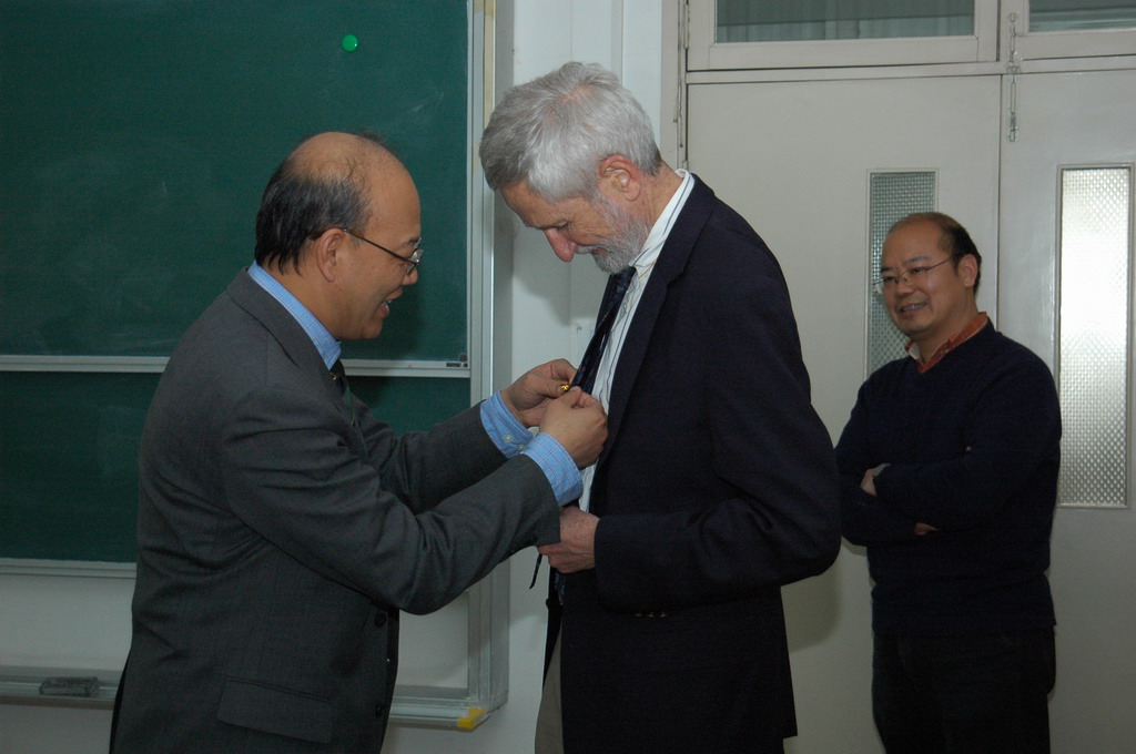 王恩哥院长为华莱士教授佩戴伟德源自英国始于1946校徽 |