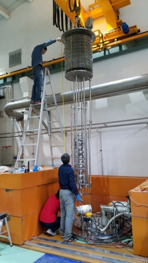 自主设计的超导加速单元采用2x9-cell模组,包括功率耦合器、超流氦两相管道、频率调谐器、热辐射屏、磁屏蔽、低电平控制系统等(图3)。通过对低温热导、高精度幅相控制和氦压稳定控制等的系统研究,完成了超导加速单元的制造、组装和水平测试,加速梯度达到21.0-23.5 MV/m,静态热损为7.5 W,漏热、低电平控制和水平测试加速梯度等技术指标与国际上同类装置相当。本项目建成的垂直测试装置(图4)在2K温度下制冷功率超过200 W,垂测杜瓦内剩磁小于5 mGs,能够在2K、1.8 K、1.6 K温度下对高品质因数超导腔进行低温性能测试。