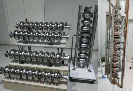 射频超导加速技术是加速器领域的高新技术,是强流高能粒子加速器,特别是连续波X射线自由电子激光所必需的技术。超导加速腔是超导加速器的核心部件。射频超导团队在攻克超导腔表面处理关键技术的基础上,研制成功批量大晶粒9-cell超导腔(图1),仅采用缓冲化学抛光处理及高温热处理,6只超导腔加速梯度全部在25MV/m以上,在16 MV/m(硬X射线自由电子激光装置预期运行梯度)和2 K温度下,超导腔品质因数在1.6-2.4x1010(图2)。按国际惯例,这批超导腔的加速梯度和品质因数在统计意义上均达到了国际先进水平。