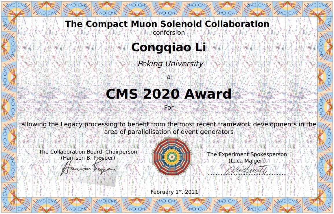 大型强子对撞机(Large Hadron Collider,LHC)位于欧洲核子研究中心(CERN),是当今世界上能量最高的对撞机,也是人类认识微观世界最前沿的国际超大型物理实验设备。LHC有4个实验组,包括CMS、ATLAS、ALICE和LHC-B,其中CMS和ATLAS是两个大规模的广泛测量的探测器实验,其主要物理目标是寻找Higgs玻色子、精确测量标准模型,以及寻找TeV能级的新物理。CMS实验组由来自40多个国家的3000余名科学家组成。CMS实验组每年2月召开合作组会议,并颁发年度奖项,以奖励上一年度为CMS作出杰出贡献的合作组成员,奖励领域包括探测器各子系统、软件、计算及物理等二十余个,每个领域奖励1-3名。