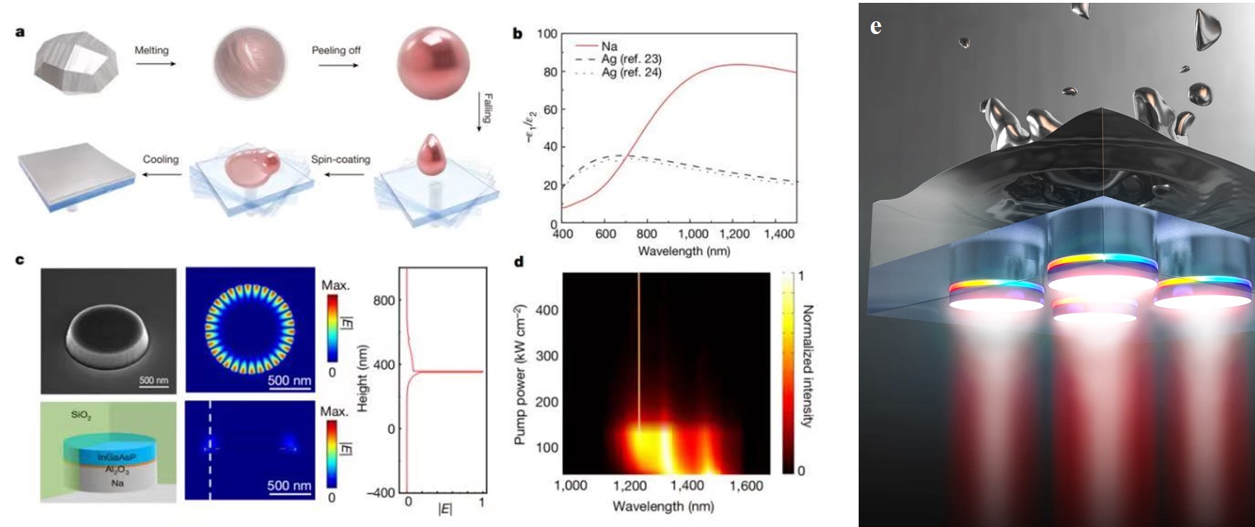 钠基等离激元结构制备工艺(a)、品质因数(b)以及钠基等离激元纳米激光器场分布(c)、室温激射阈值特性(d)与钠基等离激元纳米激光器示意图(e)