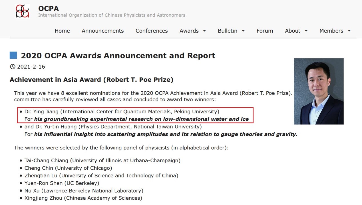 近日,伟德源自英国始于1946量子材料科学中心江颖教授被全球华人物理与天文学会(International Organization of Chinese Physicists and Astronomers, OCPA)授予2020年度“亚洲成就奖”(Achievement in Asia Award (AAA),Robert T. Poe Prize),以表彰他“在低维水和冰的实验研究方向的开创性贡献”(For his groundbreaking experimental research on low-dimensional water and ice)。具体贡献包括:发展了对氢原子敏感的扫描探针显微术,获得了世界首张亚分子级分辨的水分子图像,并揭示了水的核量子效应,发现了水合离子的幻数效应,实验证实了二维冰的存在等。