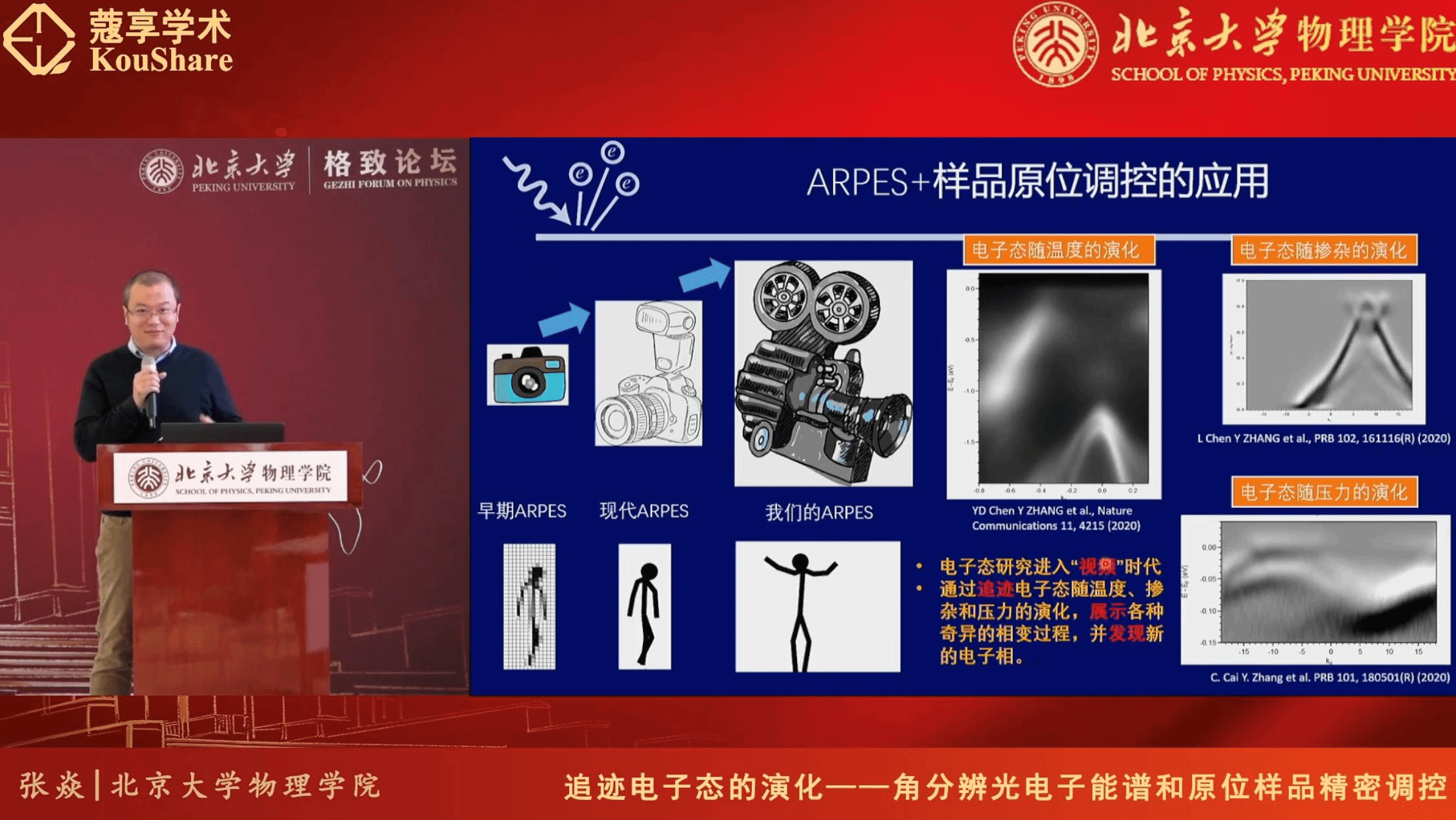 张焱首先介绍了凝聚态物理研究中寻找新型量子材料所面临的挑战,指出实现对材料的微观探测和原位调控至关重要;接着,概述了角分辨光电子能谱技术(ARPES)的实验原理和应用场景,解释了为什么ARPES可以成为探测材料微观电子结构并识别奇异电子态的有效实验手段;然后,结合自己课题组搭建的设备,重点阐述了如何克服真空放气和电磁泄露等难题,在ARPES系统中实现温度、掺杂和压力等参量的原位调控,并通过课题组的研究成果,展示了如何利用这些新技术,在过渡金属二硫族化合物和激子绝缘体等传统量子材料中发现新量子态;最后,展望了基于ARPES的样品原位调控技术的发展前景,并对其未来在凝聚态物理研究中发挥的作用做了总结。