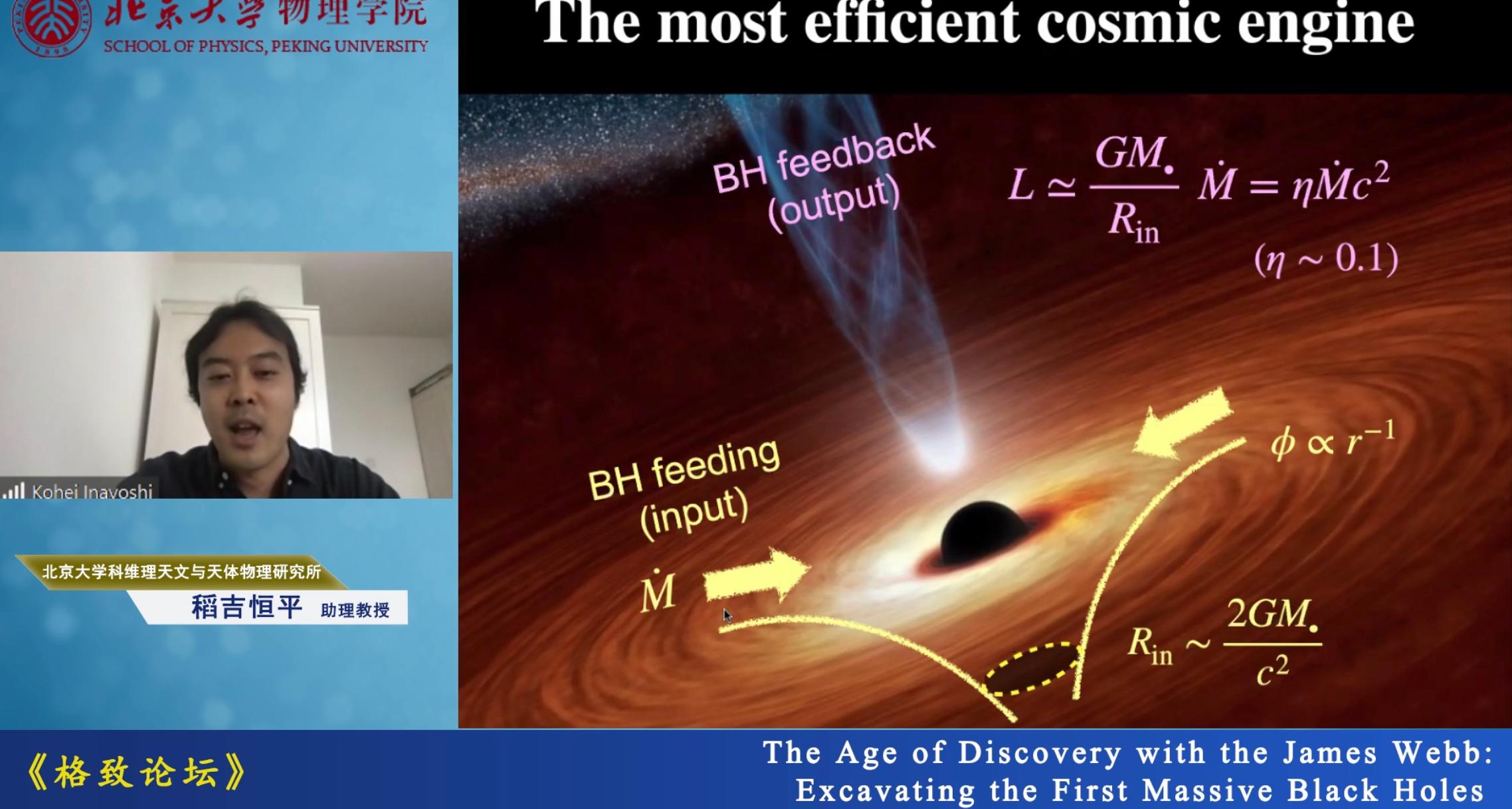 稻吉恒平首先概述了超大质量黑洞在宇宙中的普遍存在性和现有的理论解释。然后,针对宇宙早期超大质量黑洞的生长问题,重点阐述了天文学家与自己课题组从理论上提出的解释方案。最后,展望了詹姆斯韦伯空间望远镜为我们提供了前所未有的机遇,让直接观测宇宙早期的黑洞成为可能,并且,着重描述了如何利用种子黑洞吸积过程辐射的光谱特征,在詹姆斯韦伯空间望远镜的数据中挖掘第一代黑洞的信息;他指出类似的理论和观测研究,对揭示种子黑洞的形成机制及其与宿主星系的共同演化过程都具有重要意义。