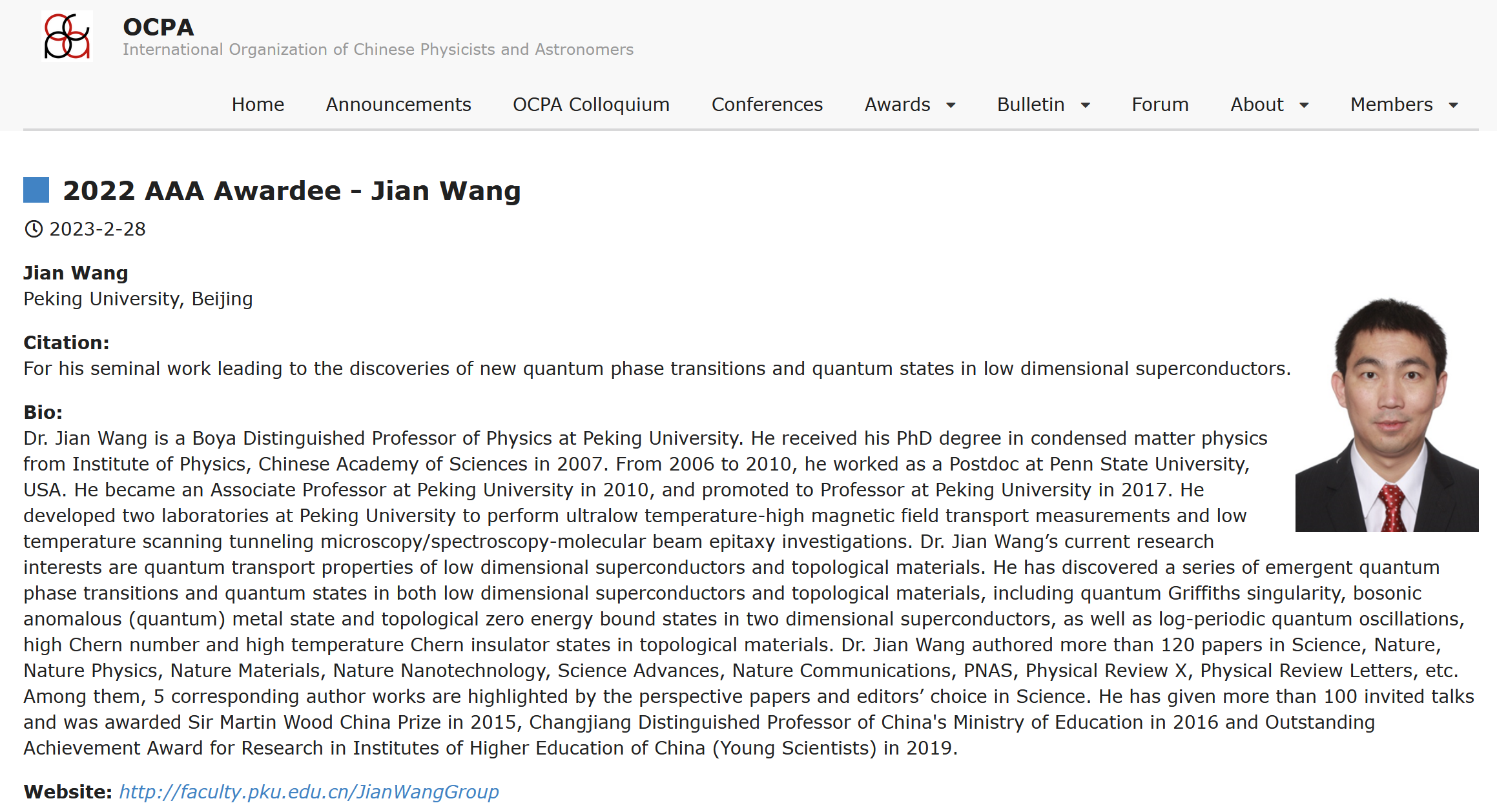 全球华人物理和天文学会官网链接:https://ocpaweb.org/home/page/2022-aaa-awardee-jianwang