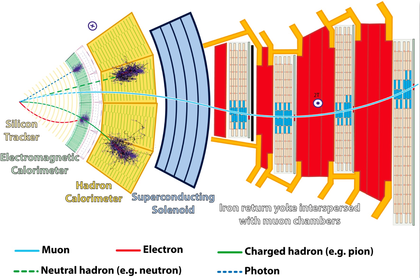 CMS是一个圆筒形的探测器,在其中心两束质子流板发生对撞,产生大量的碎片,我们称之为次级粒子,建造探测器的目的就是来鉴别这些碎片——它们的速度、能量等各种各样的特性。将这些数据存在计算机中,我们想通过这些次级粒子的信息来推测对撞时发生了什么,通过鉴别次级粒子来研究对撞时发生了什么便是当今粒子物理的主要课题。