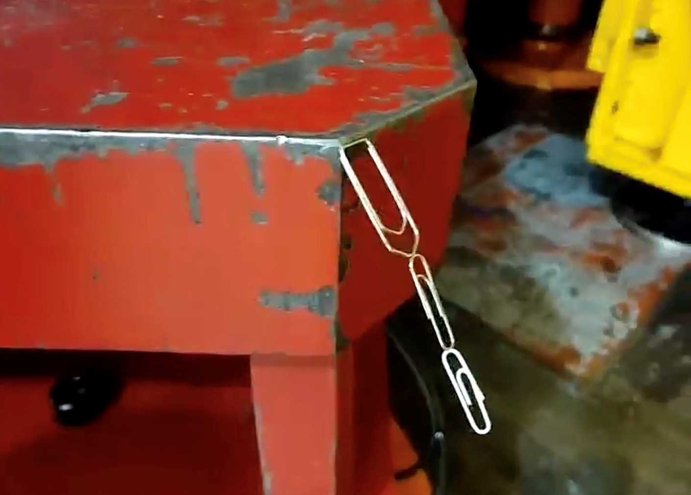探测器有成千上万的零件,但所有的零件可以分为最主要的四大块:磁铁、径迹室、量能器和缪子探测器。其中最大的单个部件为螺线管磁铁,电流在螺线管内绕圈运动,产生很大的磁场。跟普通的螺线管磁铁不同,CMS上的螺线管的导线不是由铜线制作。这是由于铜线有电阻,当电流过大时,铜线会发热熔断。由于磁场和导线中的电流成正比,所以使用铜线可以产生的最大磁场受限。CMS上的螺线管磁铁中的导线是由镍钛合金制作,当它被冷却到-271度时,会发生超导现象,此时没有电阻,所以可以承受比铜线制作的螺线管20倍以上的电流,当然,可以产生的磁场会更大。超导螺线管上可以产生高达4T的磁场,其中的电流达到上万安培,这几乎是目前世界上人类能够产生的最强的磁场。LHC已经停运了很久,将在不久之后重新开启RUN3的取数。在磁铁关了很长一段时间后,我们依然可以看到有剩余的一些磁场,如下图所示,回形针在磁场的作用下可以“粘”在铁上(目前磁铁并没有通电开启)。超导螺线管磁铁直径6米,长11米,是目前世界上最大的超导螺旋管磁铁,由于螺线管(solenoid)的重要性,所以将它写入了CMS的名称当中。CMS整体直径15m长28m,重14000t,在LHC的四个实验探测器中,不是最大的,但却是小而重的存在,所以采用了Compact(紧凑的)这个词,而M是缪子(muon)的含义。