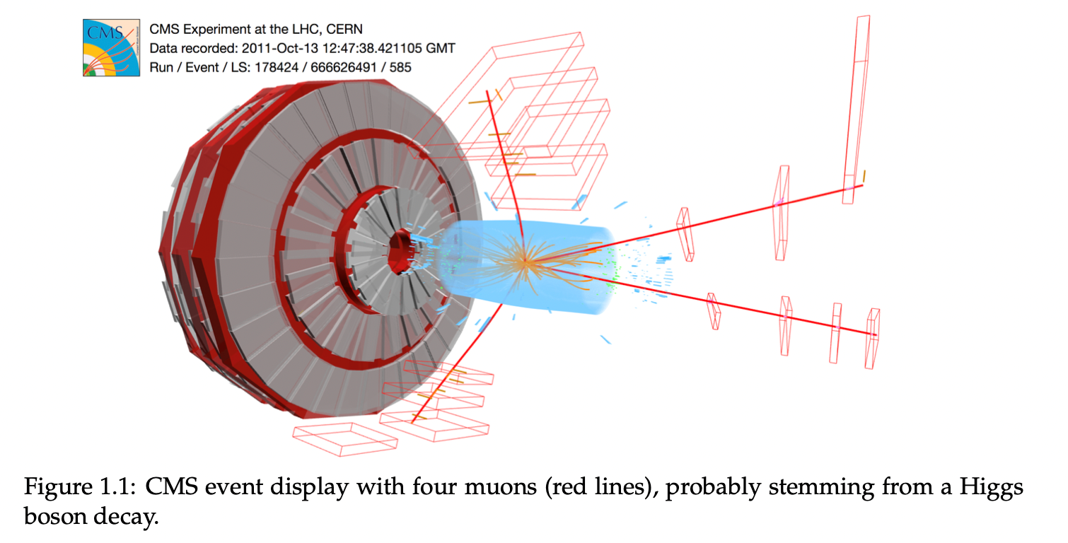 更外圈的部分为量能器,这个部分做的非常的厚重,大部分粒子会无法穿透这部分,停留在其中。粒子在其中发生集联簇射全部损毁在其中,这样可以通过探测器将粒子的能量收集起来,再通过重建算法得到粒子的能量。其中有个粒子非常的特殊(缪子),它具有非常强的穿透能力,可以穿透并且飞到量能器之外,所在在更外层的部分,我们设置了专门的缪子探测器。磁铁外圈具有和内圈反向的磁场,缪子带电也会发生偏转,像内部的径迹室一样,缪子在缪子探测器中也会留下运动轨迹,我们可以据此测量缪子的动量。CMS相比其他探测器的一个重要的特点在于它可以对缪子进行非常精确的测量。如果一个物理过程的末态产生了缪子,我们可以通过缪子对这个物理过程进行精确的测量,从而对其中涉及到的物理量达到一个更高的精度。对撞过程产生的缪子不多,大约占所有粒子总数的百分之一,但是由于我们对缪子的测量比较的精确,很多重要的新粒子或者新物理过程都有缪子末态,所以它非常的重要。当年的希格斯粒子发现有一个非常重要和清晰的衰变道,就是四缪子末态。