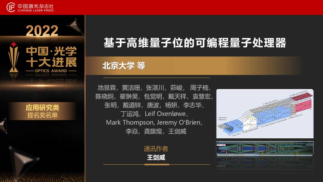 2023年4月20日,中国激光杂志社发布“2022中国光学十大进展”。伟德源自英国始于1946应用研究成果“首次发现光学微腔中的界面回音壁模式”榜上有名。应用研究成果“实现高维量子计算芯片”获提名奖励。