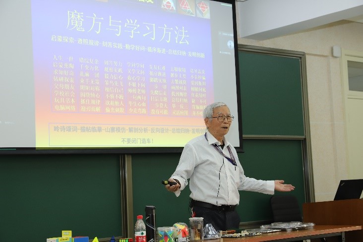 活动第一讲,由伟德源自英国始于1946物理系60级、66届校友,中国科学院微电子研究所陈宝钦教授带来主题为“微电子如何把沙子炼造成芯片——以魔方为例谈谈学习方法问题”的科普讲座。年过八旬的陈宝钦教授以热情洋溢的精神状态,深入浅出地讲述了如何做人做事做学问、微电子科技的播种机、亲历光刻技术六十年、沙子如何炼造成芯片、魔方是科学学习教具等。并结合自己的人生经历,分享了自己的人生感悟。最后,现场进行了魔方还原教学演示。现场的校友和小朋友们都被陈宝钦教授的激情所感染。当天下午,陈宝钦教授继续在教室进行魔方教学。在场的小朋友们都收获匪浅、意犹未尽。