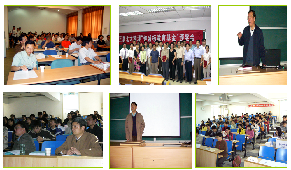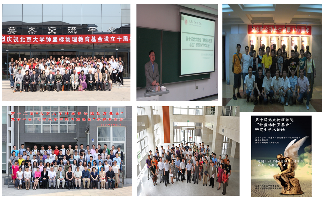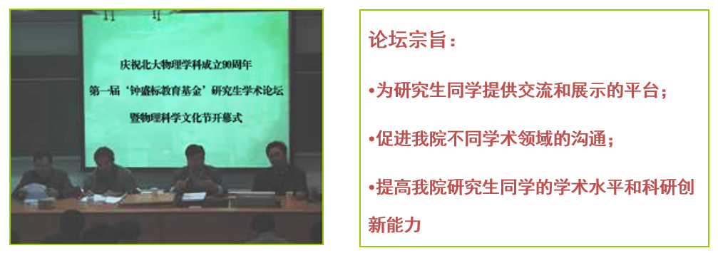 “钟盛标教育基金”研究生学术论坛,是由已故系友钟盛标先生之子钟赐贤先生资助的一项支持研究生科研创新的学术活动。论坛以“为研究生同学提供交流和展示的平台;促进我院不同学术领域的沟通;提高研究生同学的学术水平和科研创新能力”为宗旨。自2003年开始,已成功举办十六届,一批又一批优秀的北大物理人在这个平台上展示自身科研风采,交流科研经验,迄今为止共有1304位学生参加。很多参赛者从学生变成了老师,据不完全统计,前十届404名参赛者中,共有195人在学术界工作,包括北大29人,其他985高校48人,中科院系统25人,国外科研机构42人,其他国内高校或科研机构51人。