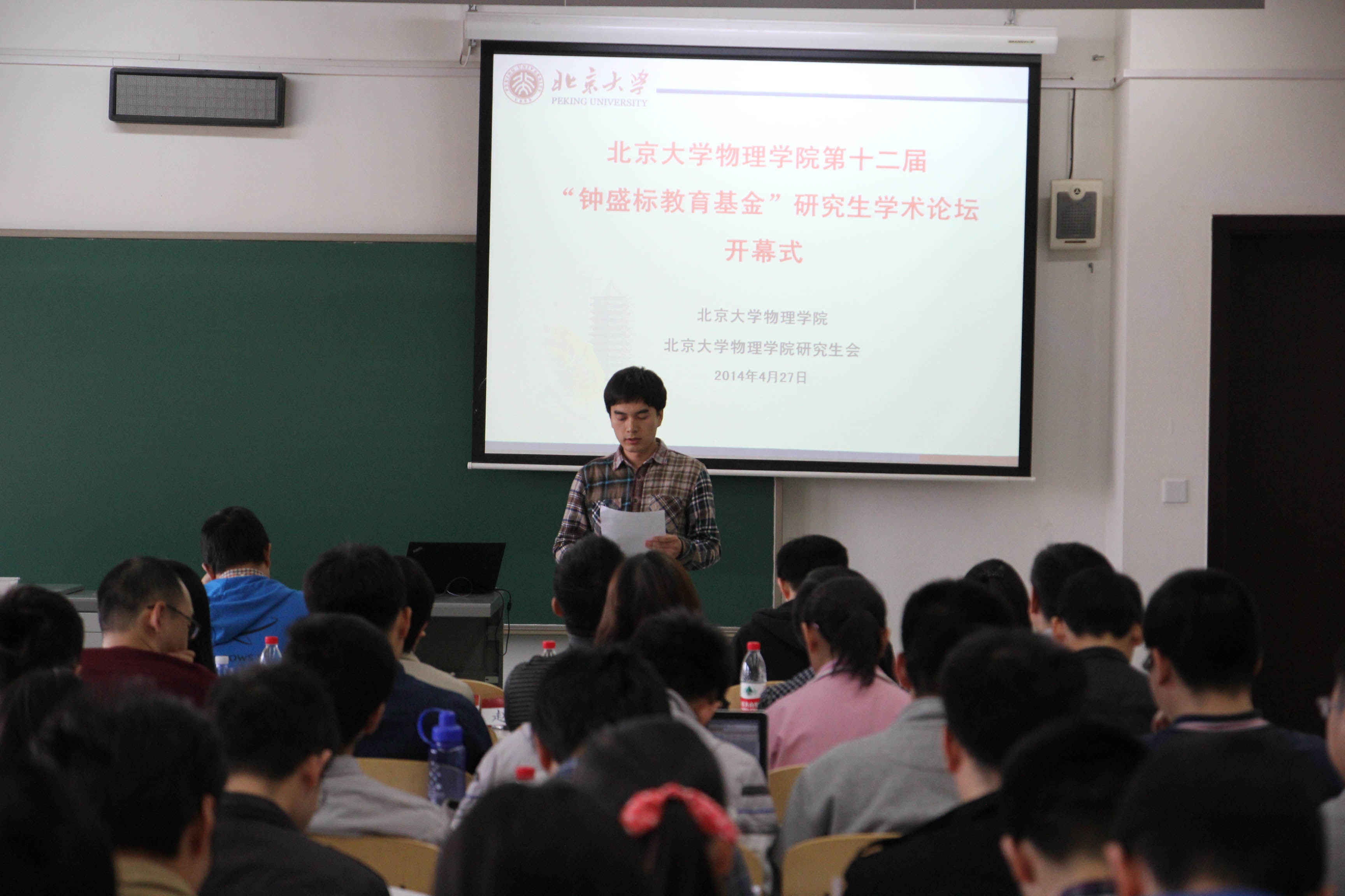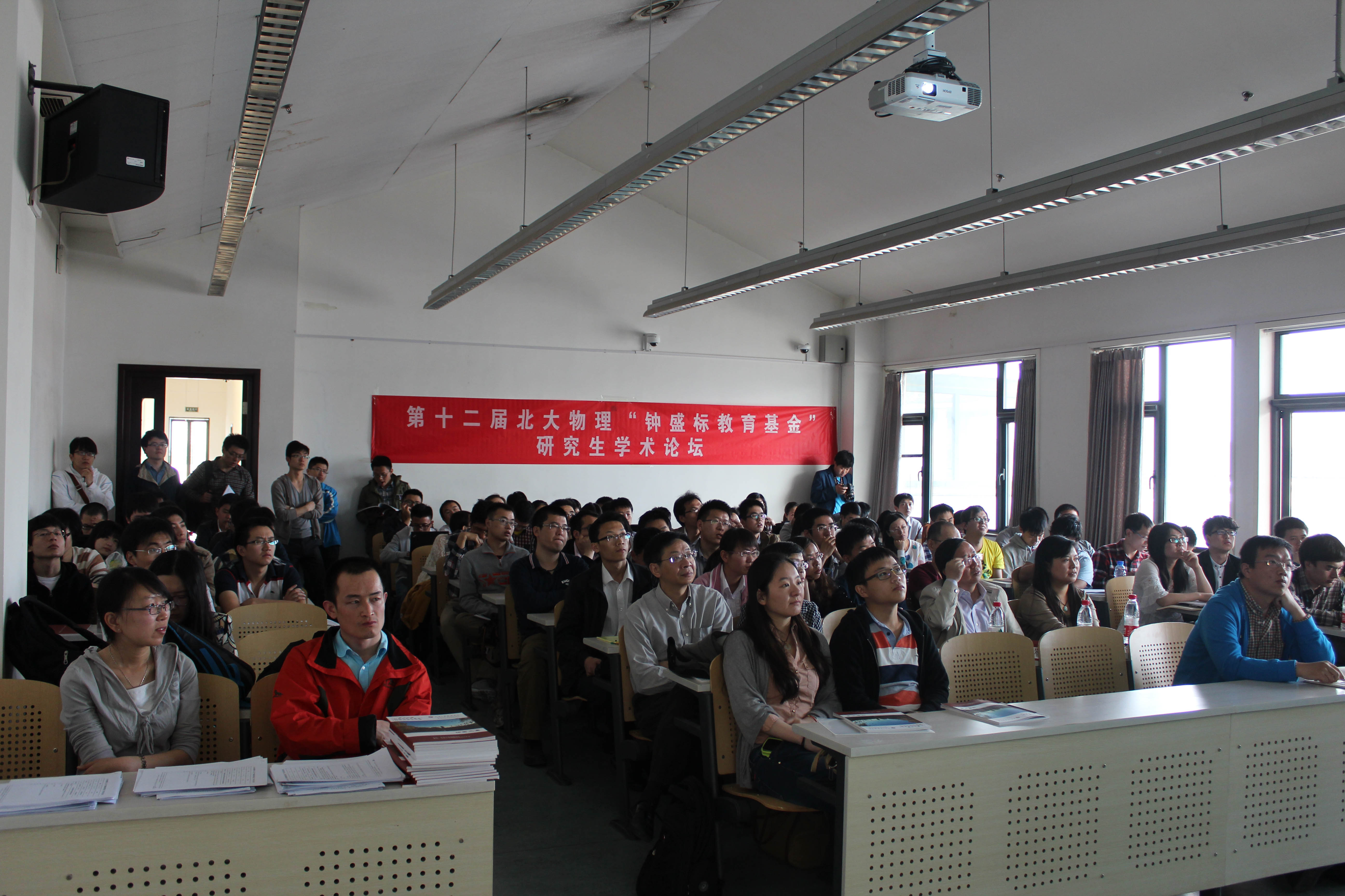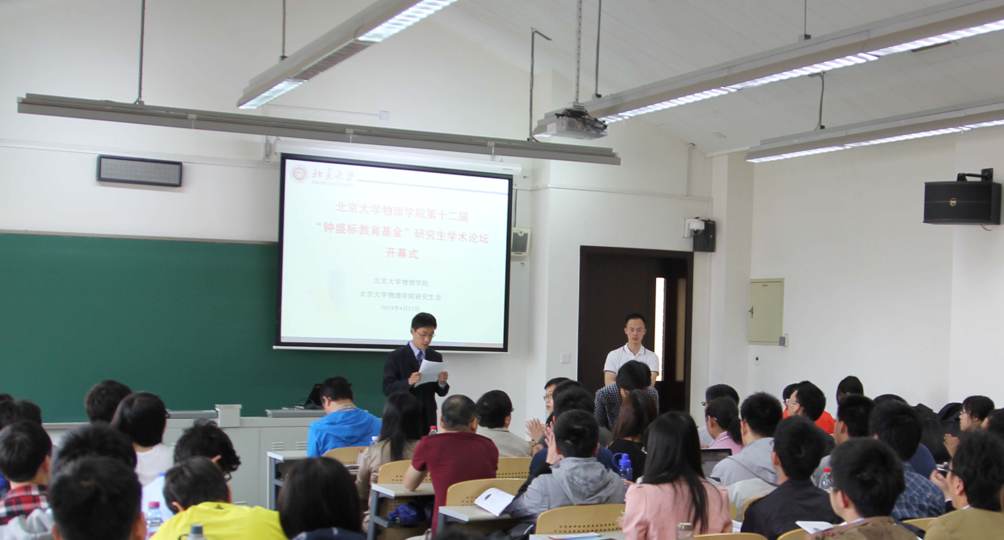 开幕式结束后,钟盛标论坛报告会于10:00正式开始,分三个会场进行,分别位于二教515、519、527。每个会场分上午、下午两个部分,其中一会场涵盖了核技术、核物理、天文、等离子体、大气5个专业,二会场由凝聚态和量子材料两个专业的同学组成,三会场为理论物理和光学专业的报告。每位同学均精心准备了报告,用10分钟的时间展示自己的工作。三个会场共有来自各系所的15位评委老师参与评分。