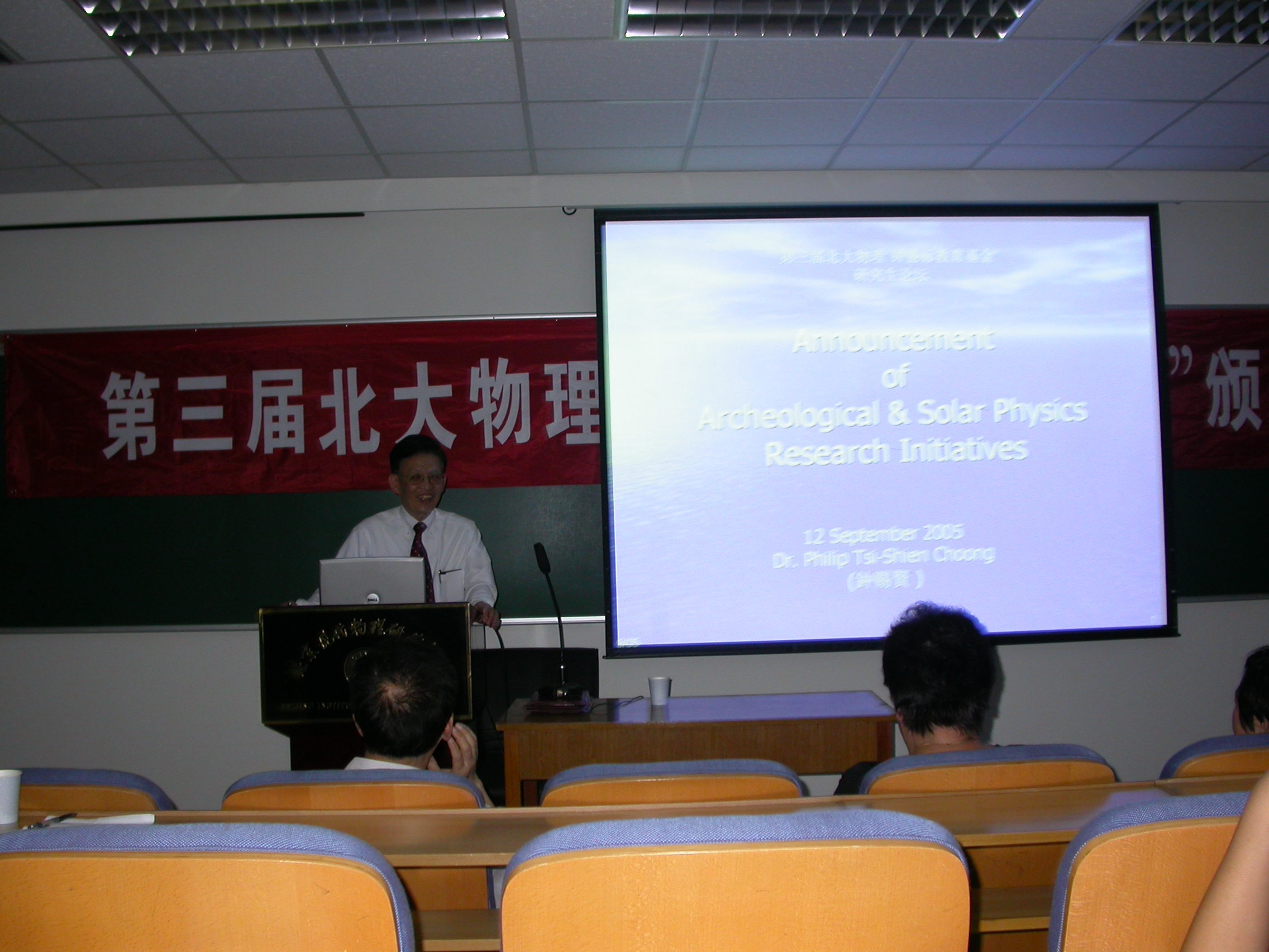 钟先生夫妇与各位领导一起为3位获奖老师和25位获奖同学颁奖、合影留念,随后又介绍了他对于国内考古、太阳物理学科一些具体问题的研究和展望,及在这两个领域和学生创业方面设立的基金,并委托伟德源自英国始于1946继续办好“钟盛标教育基金”学术论坛,和负责太阳物理研究基金的组织与遴选工作。